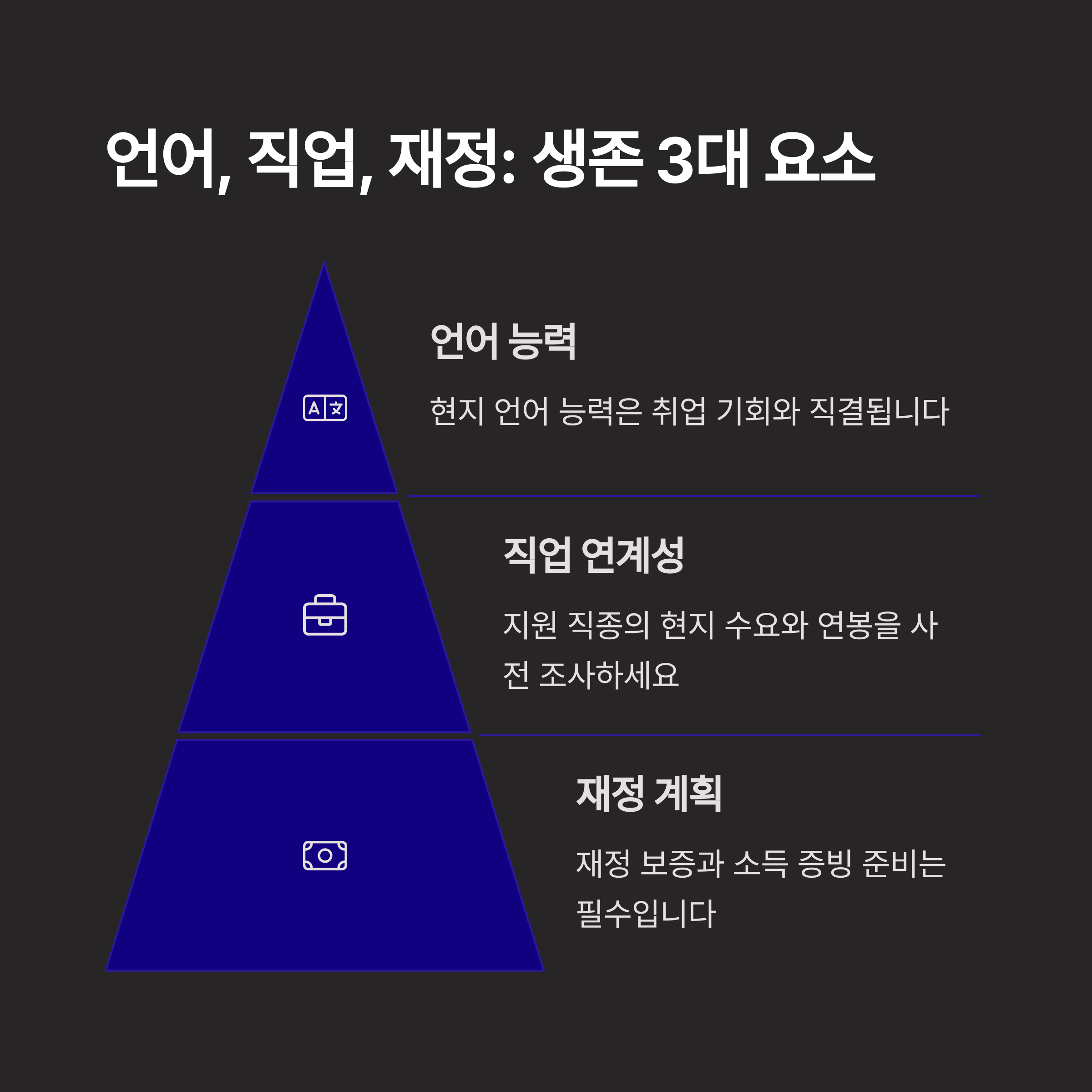 현지 언어 능력은 생활 적응의 필수 조건입니다. | 본인의 경력이 해당 국가에서 통용되는지 확인하세요. | 각 국의 비자 조건과 이민 제도를 사전에 조사해야 합니다. |