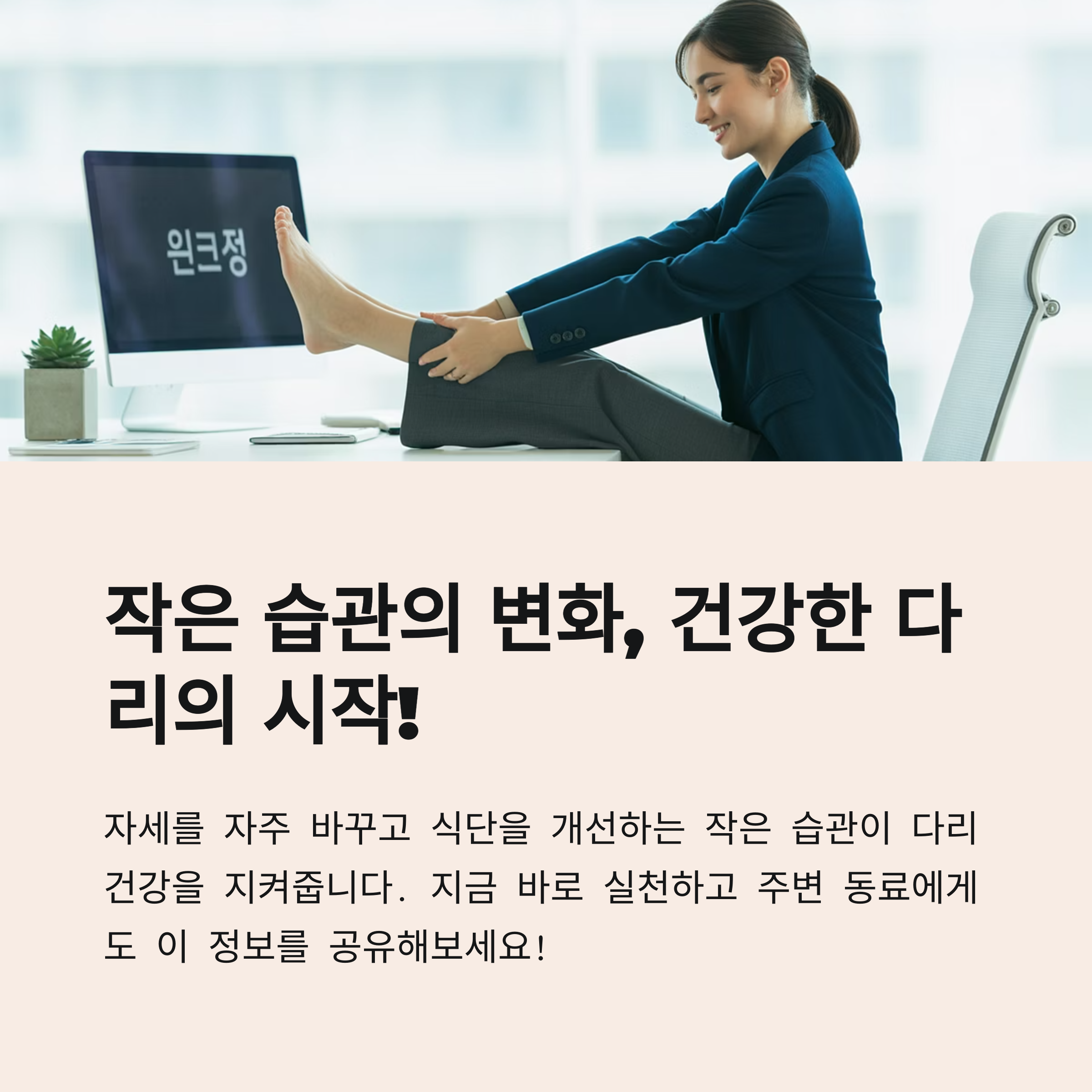 다리 붓기는 누구에게나 생길 수 있지만, 특히 장시간 앉아 있는 직장인에게는 일상 속 반복되는 고통이 될 수 있습니다. 하지만 매 시간 1분씩 투자하는 가벼운 스트레칭, 하루 한 끼만이라도 나트륨을 줄이고 수분을 충분히 섭취하는 습관만으로도 큰 변화를 만들 수 있습니다. 건강한 다리는 단순한 외모 개선이 아닌 삶의 질 향상과도 직결됩니다. 오늘부터 작지만 꾸준한 실천으로 붓기 없는 편안한 하루를 만들어 보세요.